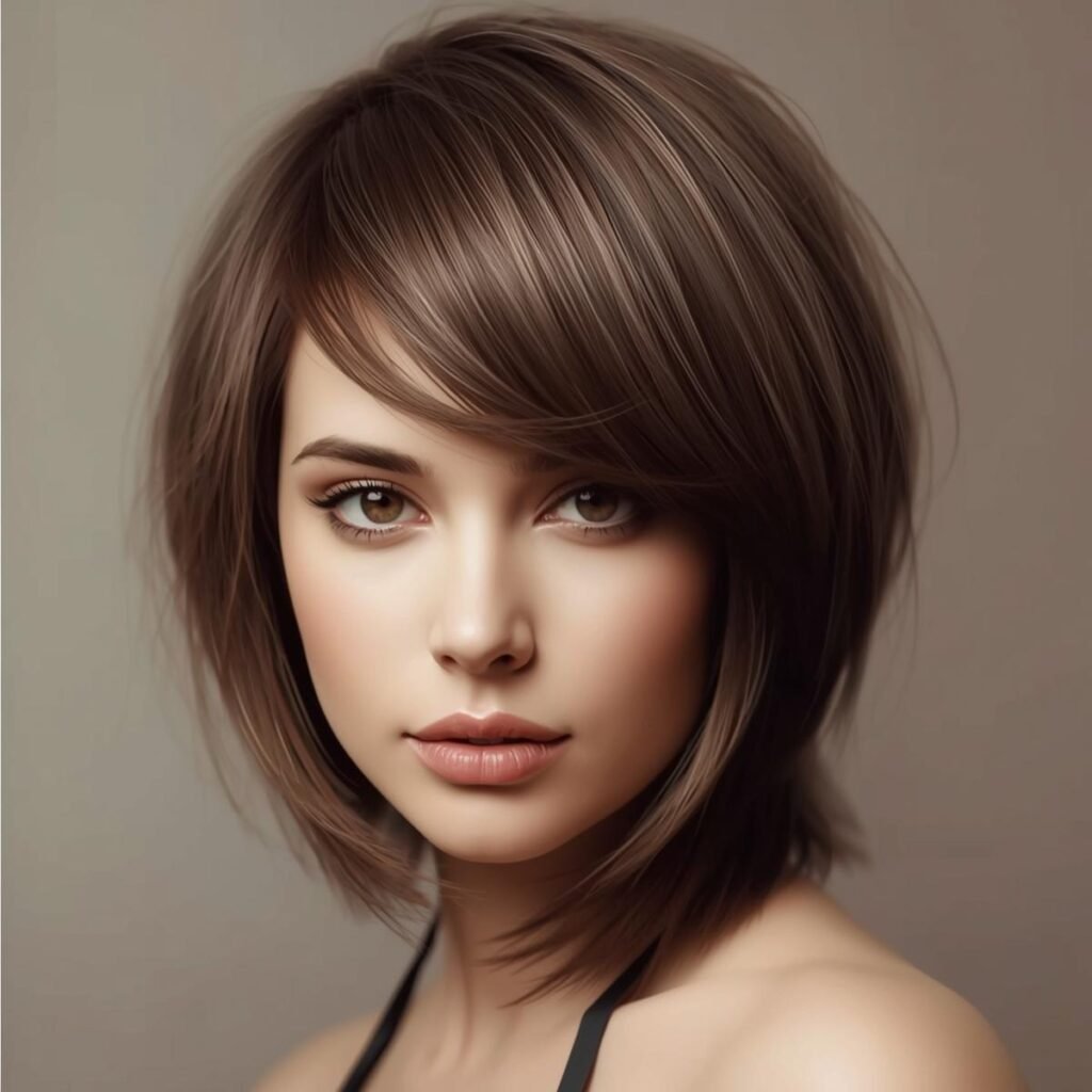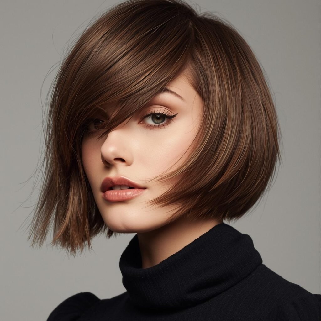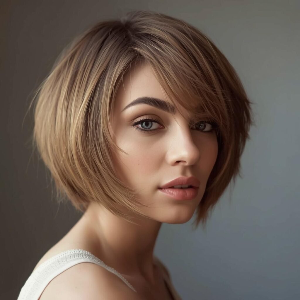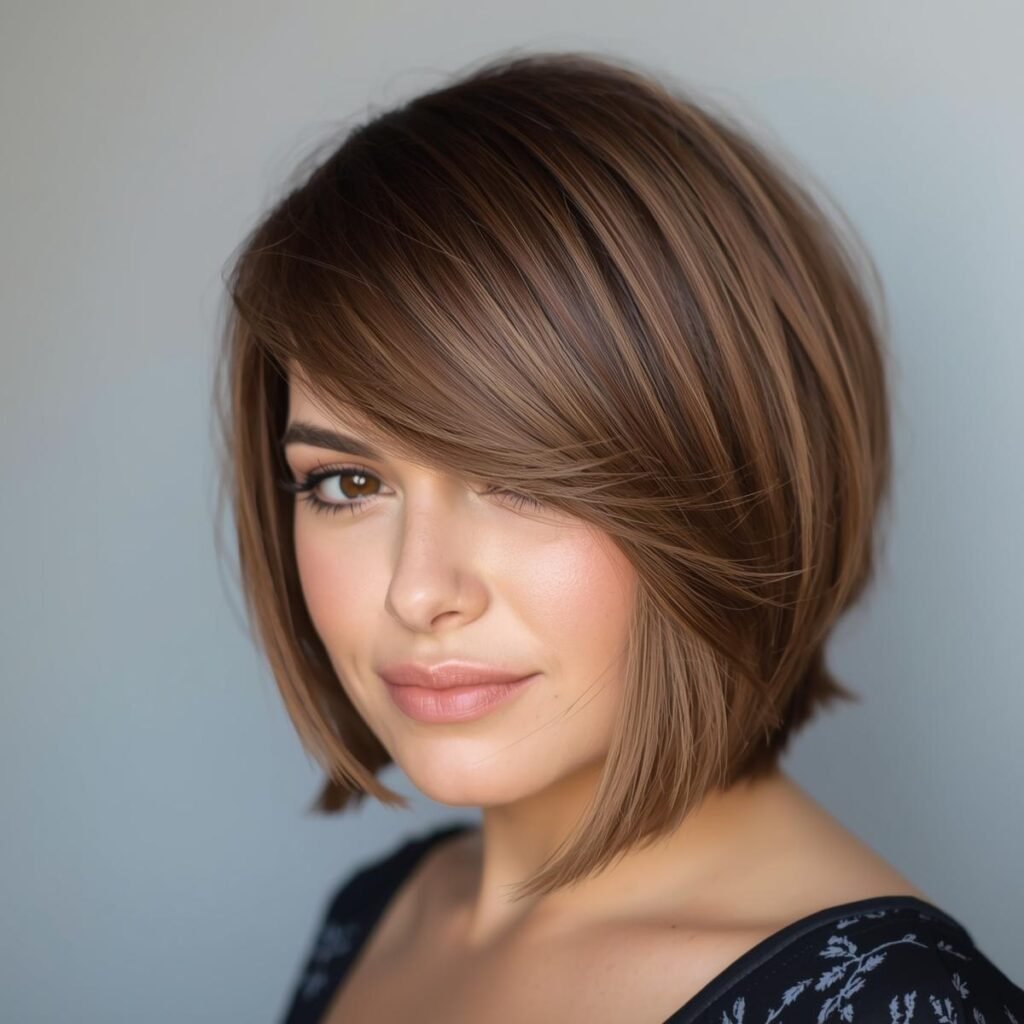 Ladies with round faces can take inspiration from this angled haircut. The side-swept bangs and medium bob silhouette help frame the face in a soft, flattering way.