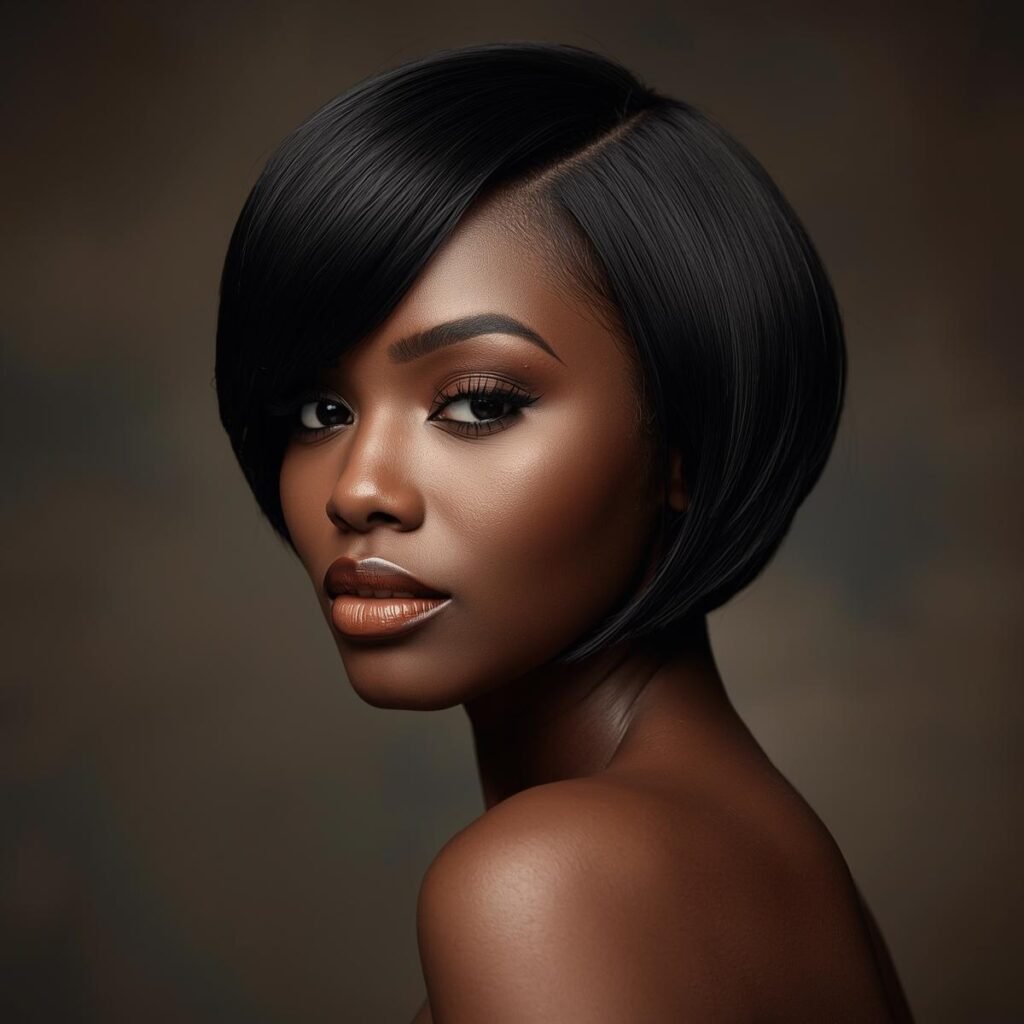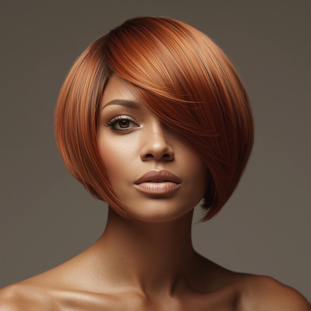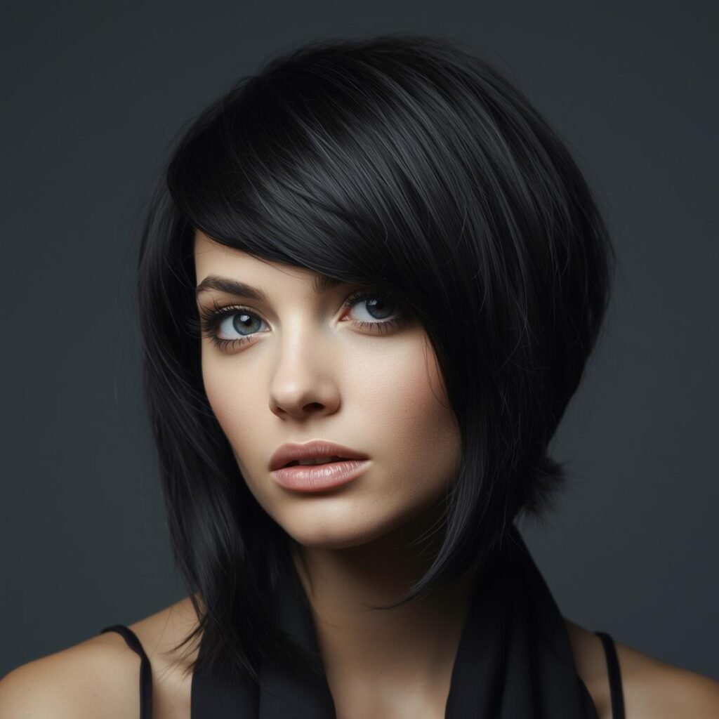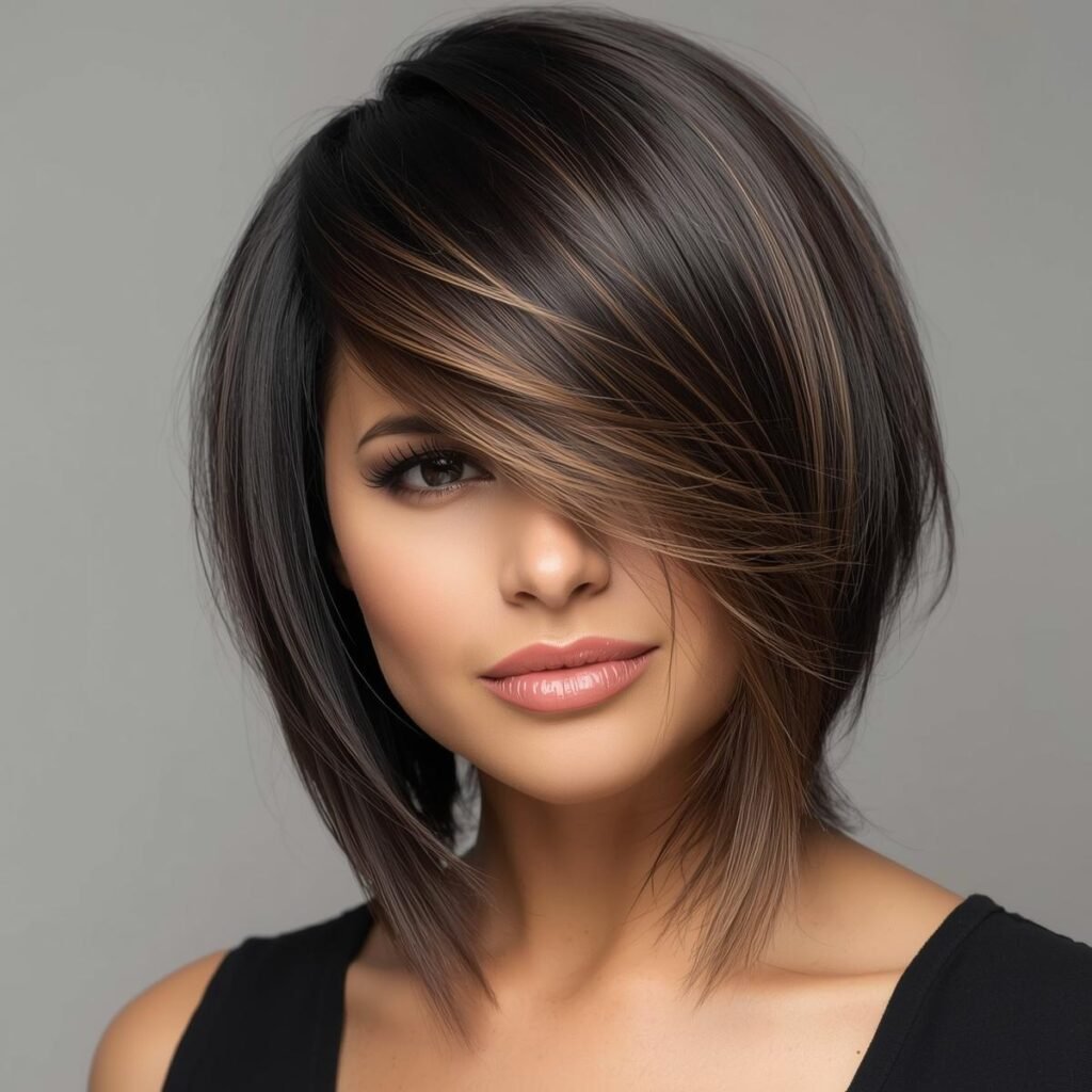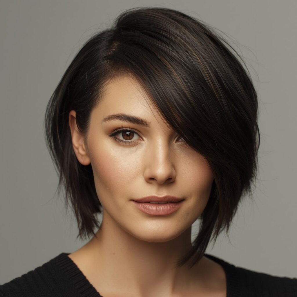 Ladies with round faces can take inspiration from this angled haircut. The side-swept bangs and medium bob silhouette help frame the face in a soft, flattering way.