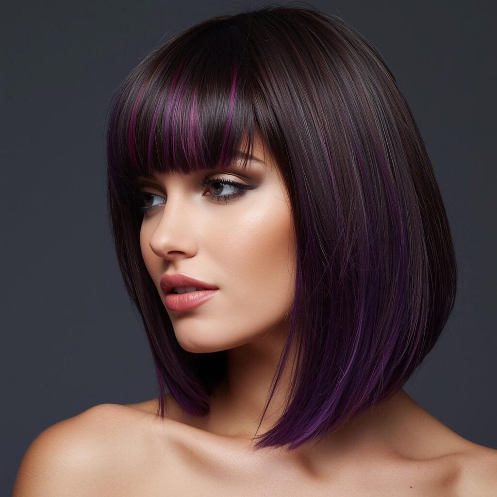 Short asymmetrical bob, long bangs, black hair, and purple highlights. What could you want more from a mysterious and alluring look?