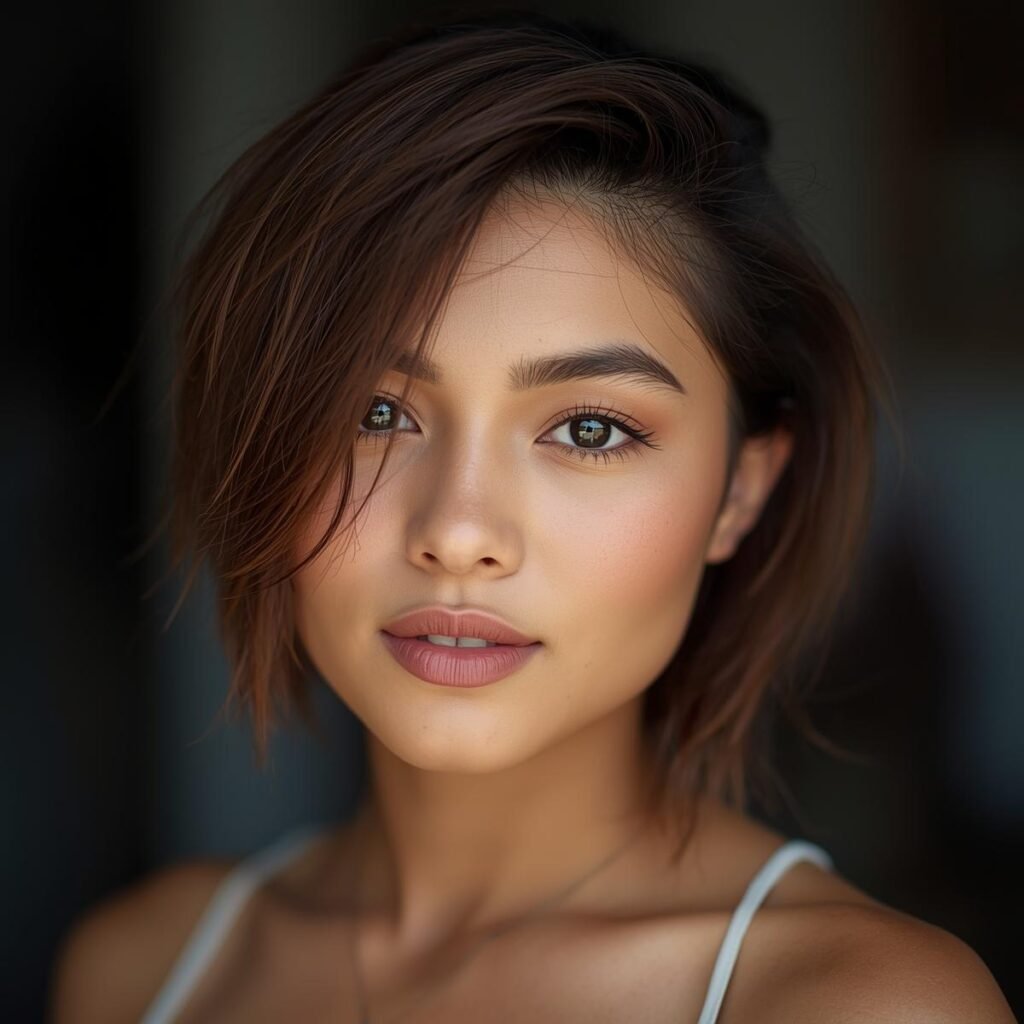 Who said bangs have to be long, straight, and perfectly aligned with your eyebrows? If you’re open to experimenting with asymmetrical haircuts, consider trying short bangs for a playful twist.