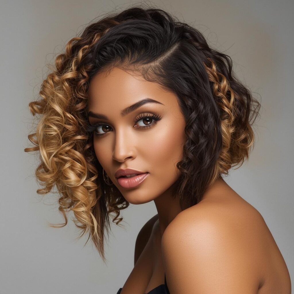 Returning to natural asymmetrical haircuts, ladies with corkscrew curls can absolutely enjoy these styles too. The unique texture adds volume and personality, making the cut look even more dynamic.