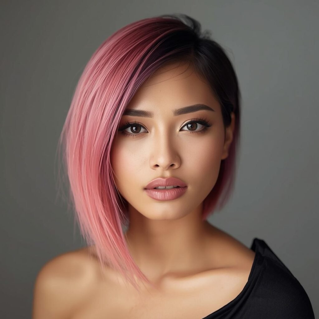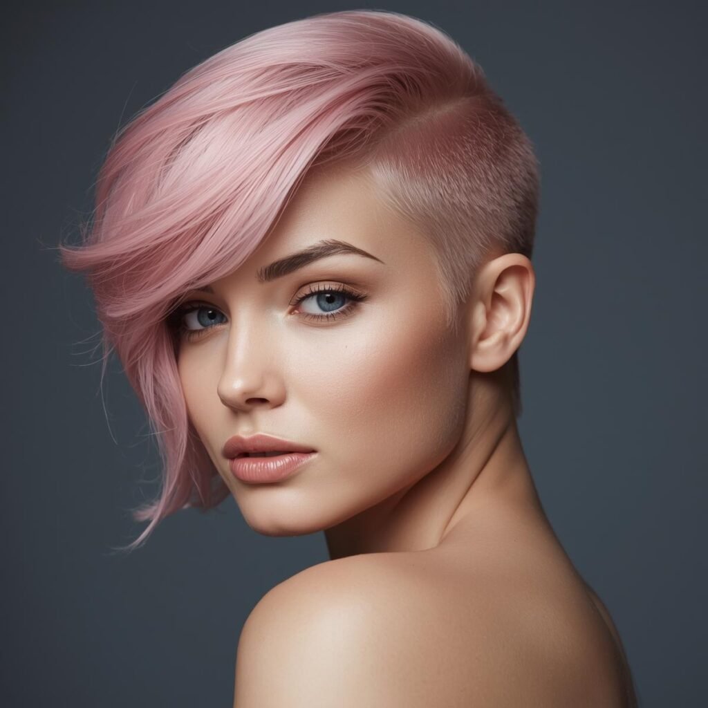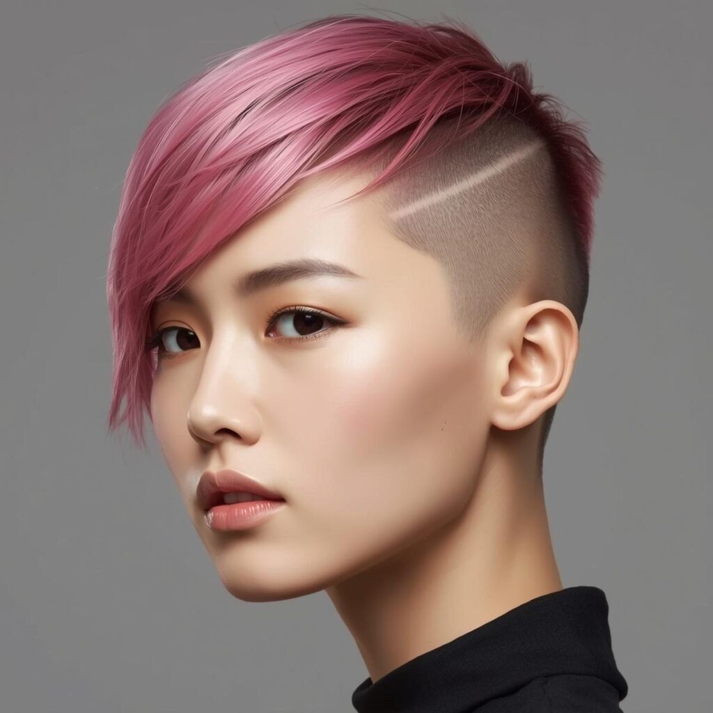 The metallic pink hair color adds a dazzling touch that makes the cut stand out even more.