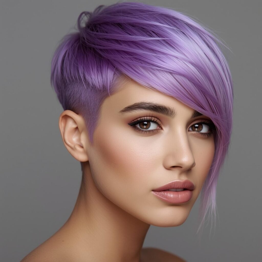 We love flashy colors but are equally fond of pastel shades. If you love lavender hair, check out this courageous asymmetrical haircut that starts with a pixie base and has super-long bangs.