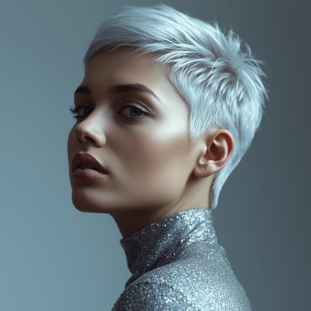 If you have pale skin and want an eye-catching pixie haircut, consider dyeing your hair a bright white shade. The bold color paired with a short cut creates a striking, modern look that instantly stands out.