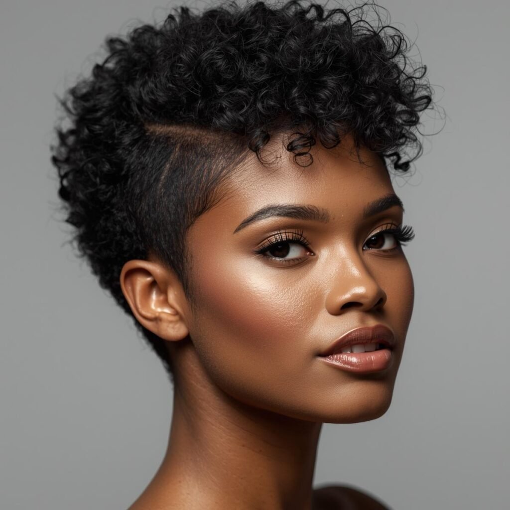 Embrace your glamorous afro locks boldly! You can trim your curls into an asymmetrical mohawk that looks elegant and edgy at the same time.