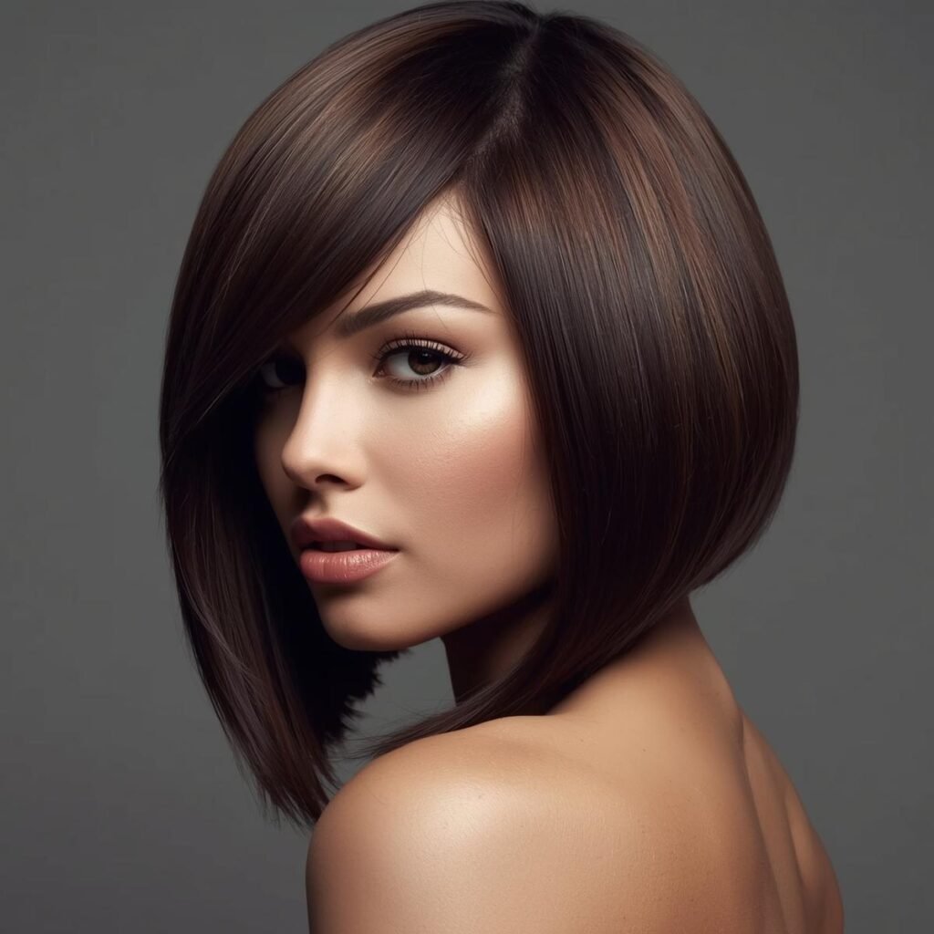 Most angled bobs slope forward, with shorter hair in the back and longer pieces framing the face. This creates shape, movement, and a sculpted finish that feels modern and intentional.
