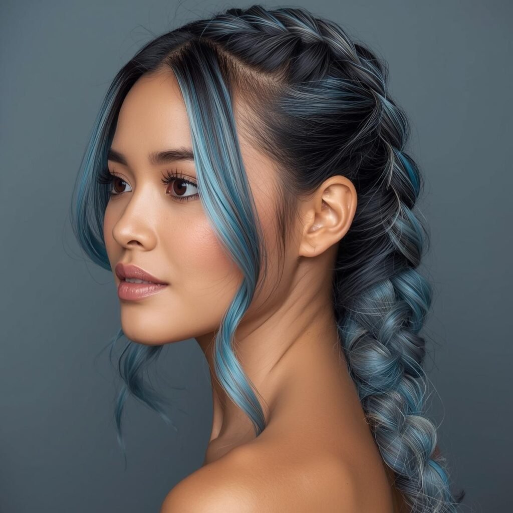 This dark silver-blonde with electric blue highlights is a truly fabulous mix – made all the more perfect by that fishtail braid too. Yet again, this is a flattering hair coloring choice for bohemian or rebellious women.