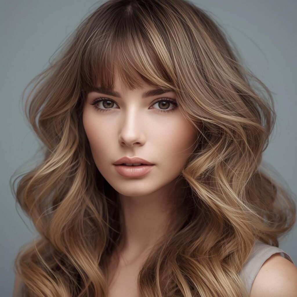 Long and layered wavy hair looks charming with some relaxed bangs. Cut the other strands around your face in progressive layers to add a natural touch.