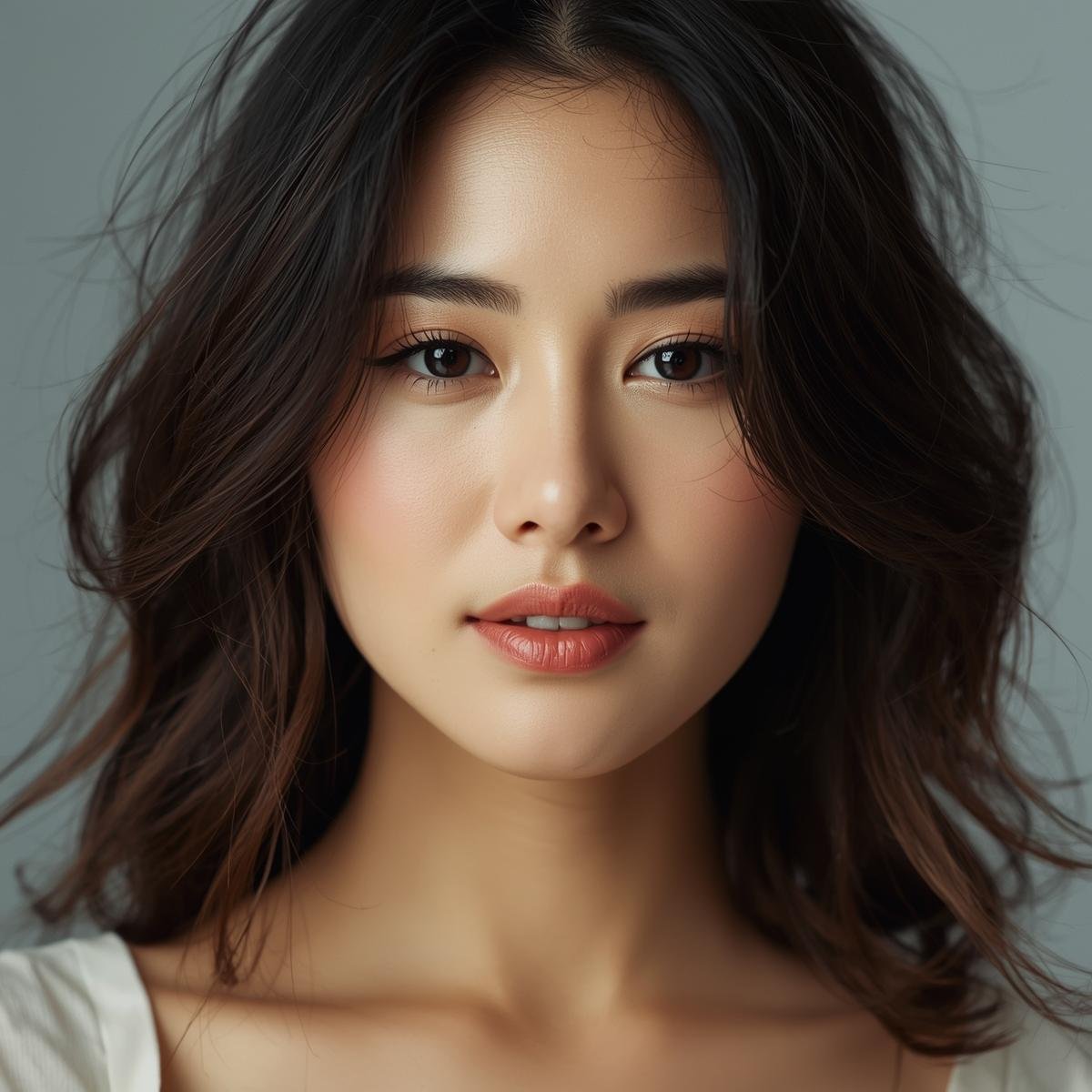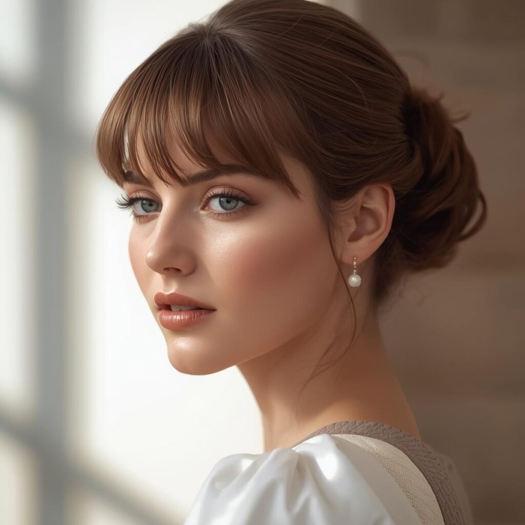 Take inspiration from her swept-up bun with straight bangs, a simple yet elegant style that’s sure to turn heads.