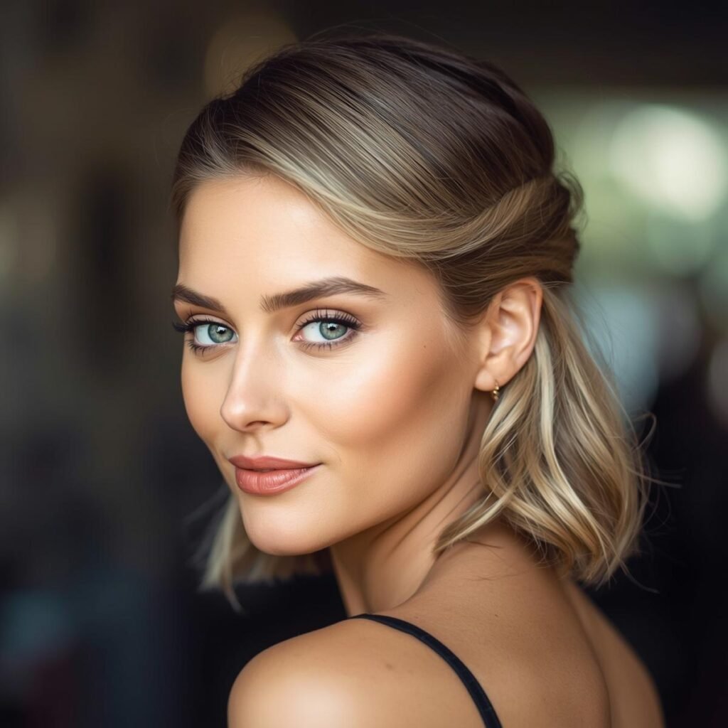 If you’re fond of the golden age, you can use it as inspiration for your shoulder-length hairstyles. While, in essence, this is a simple ponytail, it has a few details that make it glamorous.