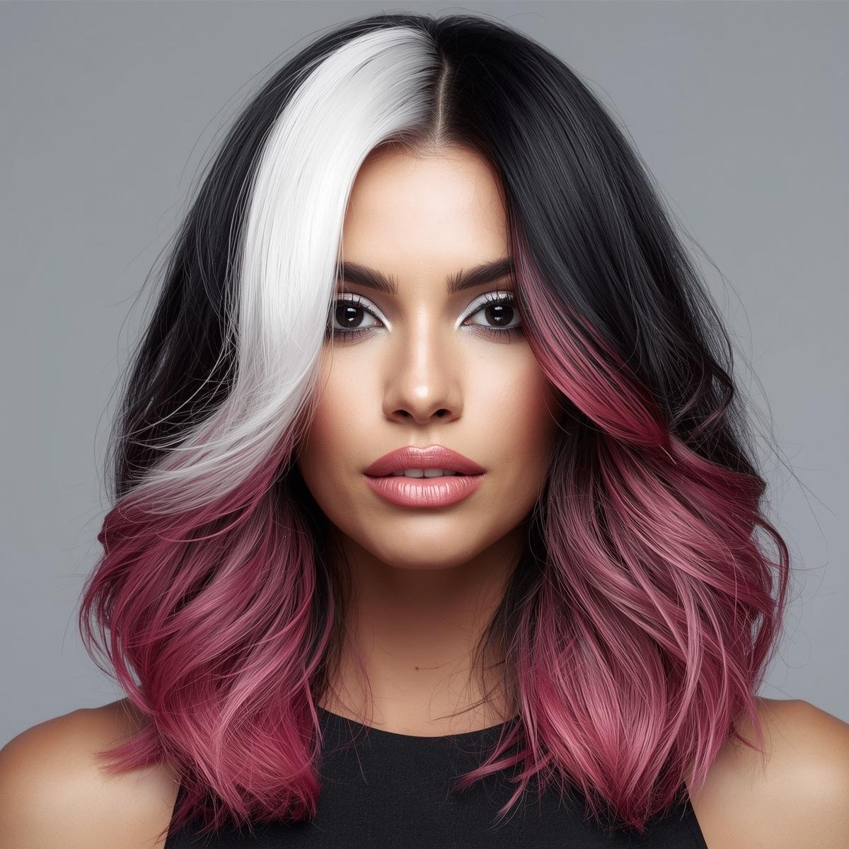 Shoulder-length hair is so fun to experiment with, especially when adding funky colors. She chose a bold hot pink shade with a white money piece in the front for contrast.