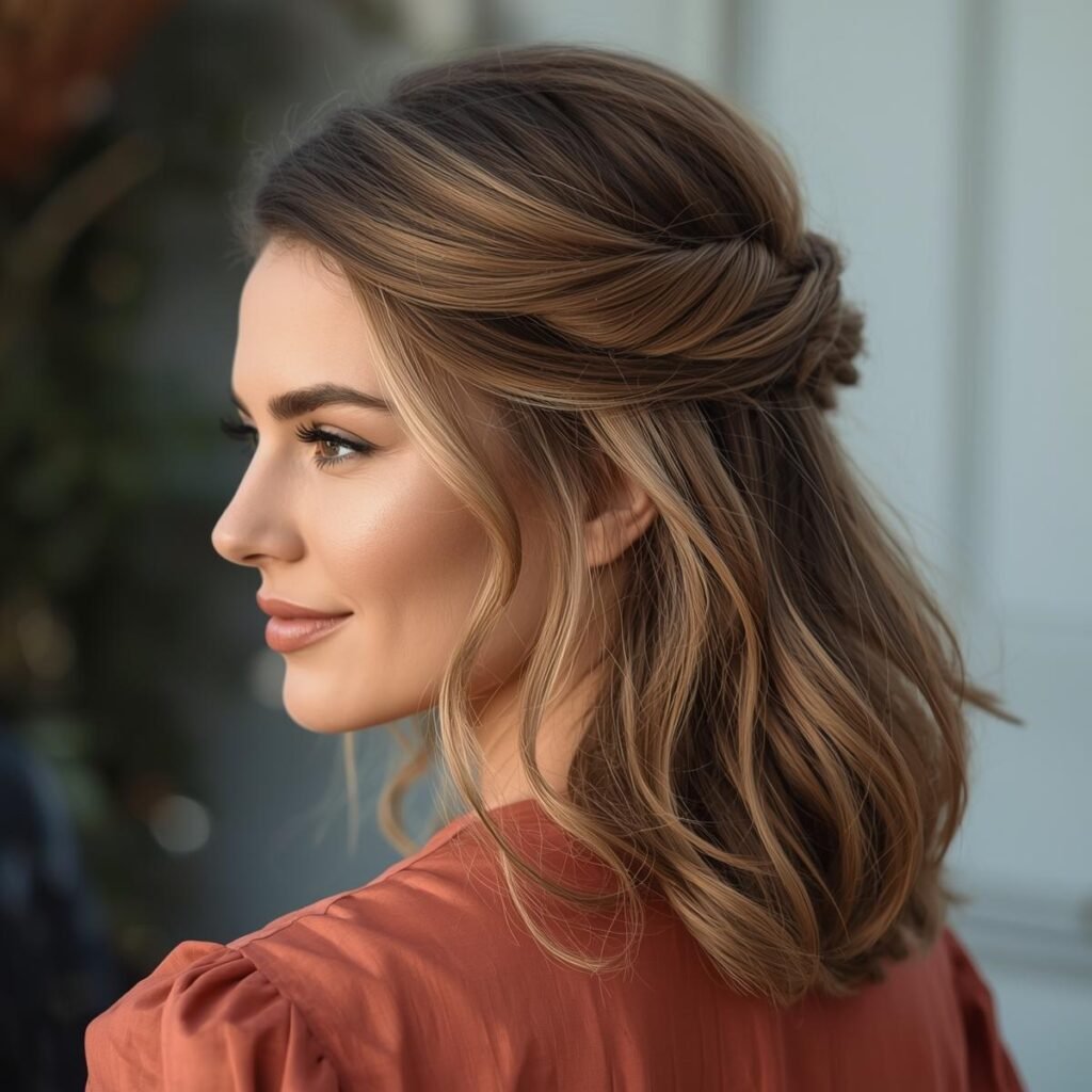 This example shows how you can branch out with half-up, half-down styles for shoulder-length hair. Instead of a bun or ponytail, try overlapping the strands and pinning them in place.