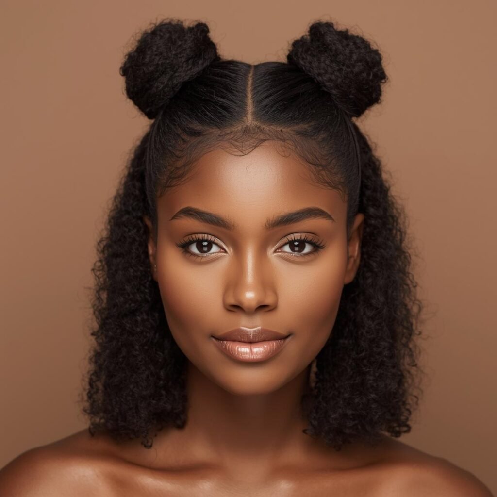 Natural shoulder-length hair is always a joy to style. If you don’t want to go full afro, you can gently tame your curls and tie two small buns on top for a playful, easy look.