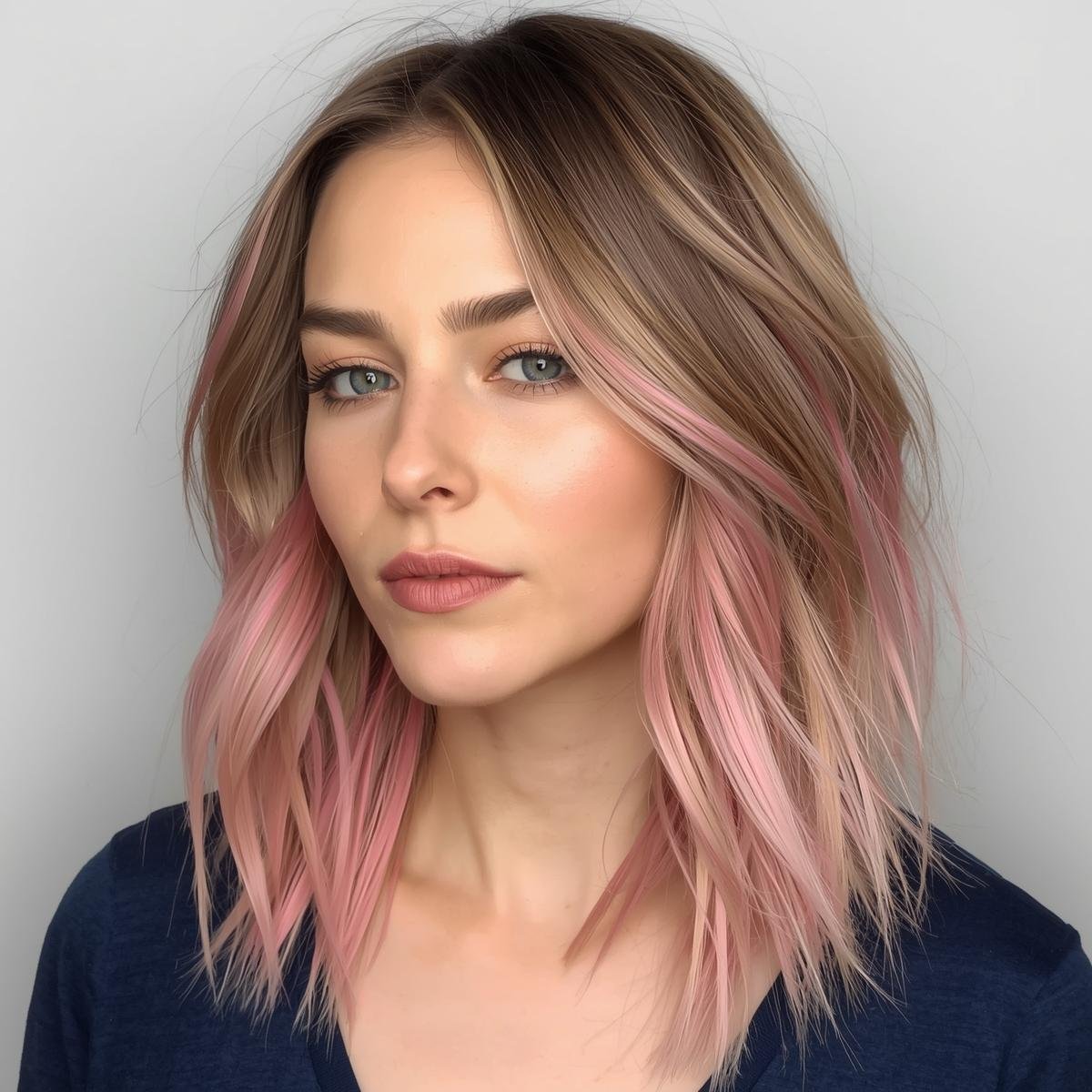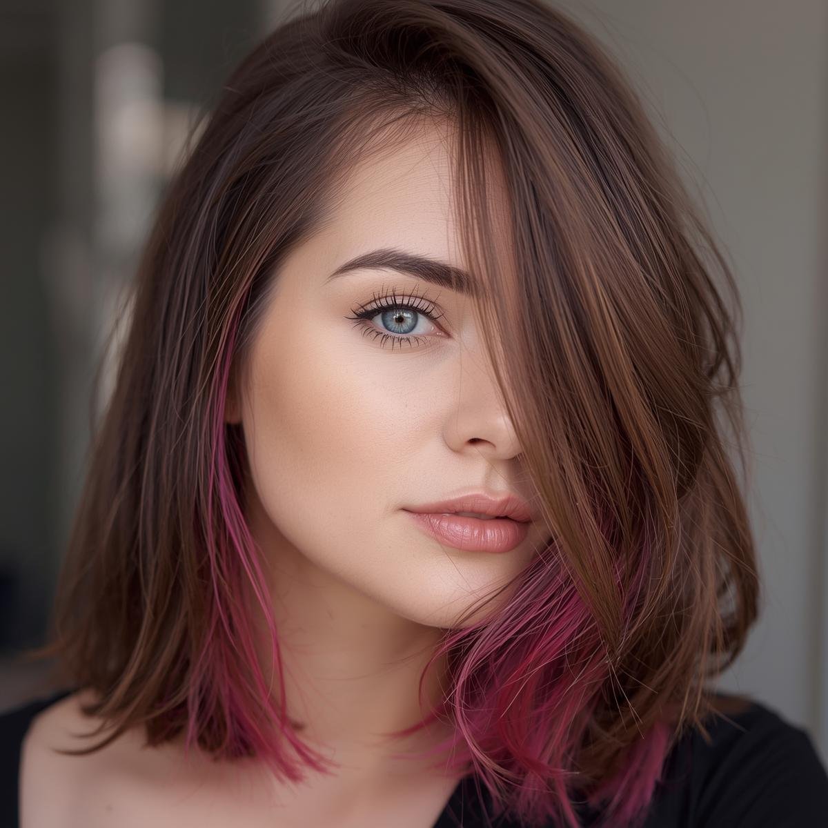 Peekaboo styles are a fresh and fun way to create something new. Keep most of your hair brown and add pops of pink underneath for a playful surprise.