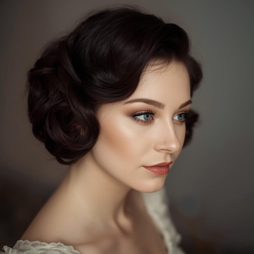 Shoulder-length hairstyles for weddings are a sheer joy to behold. Experiment with big, loose curls and a statement piece for a retro touch. An example is this large pearl accessory pinned above the ear.
