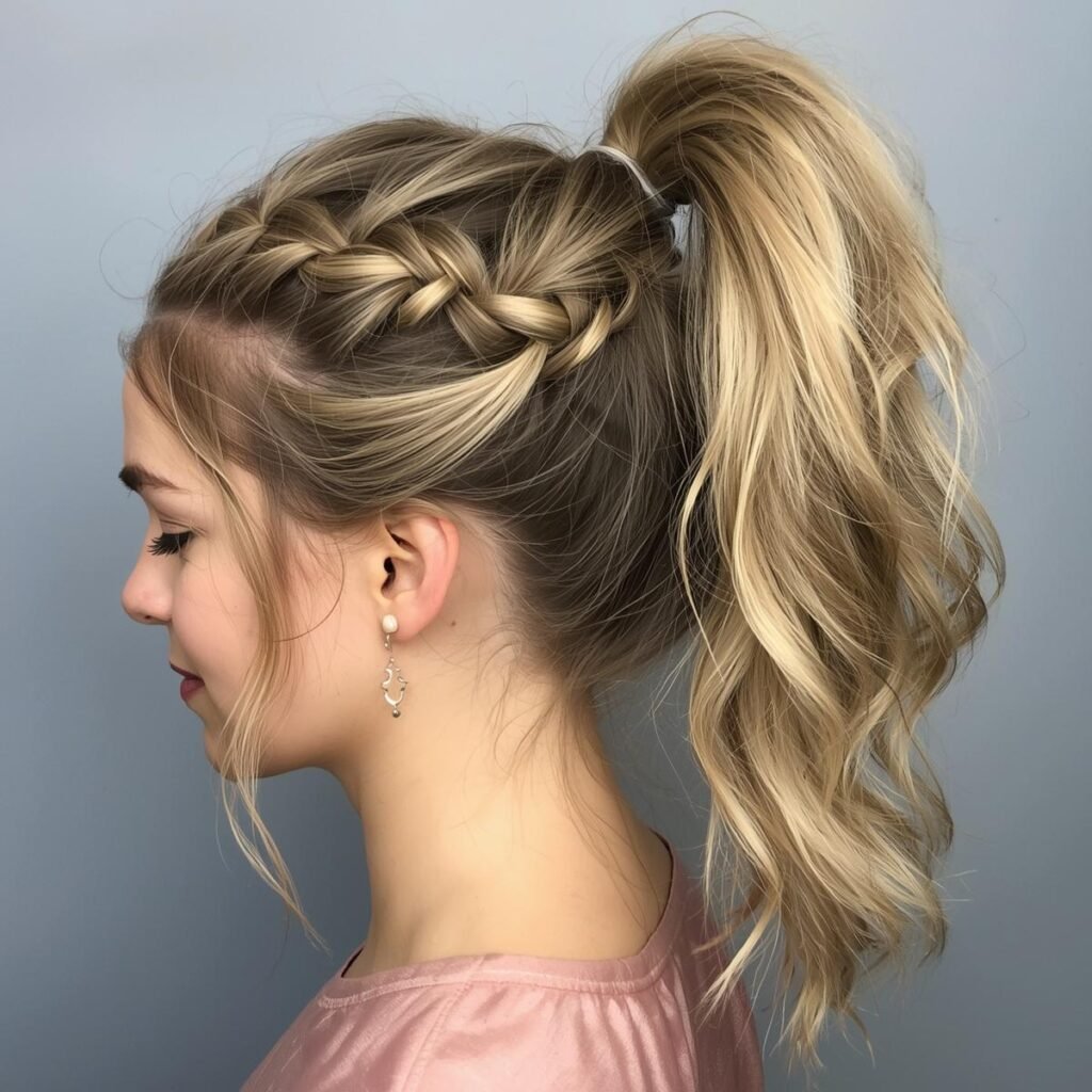 This hairstyle is so easy that it can be achieved in minutes. Simply loosely French braid the hair on top of the head and then, at about mid-level, tie all the hair in a high and pouffy ponytail.