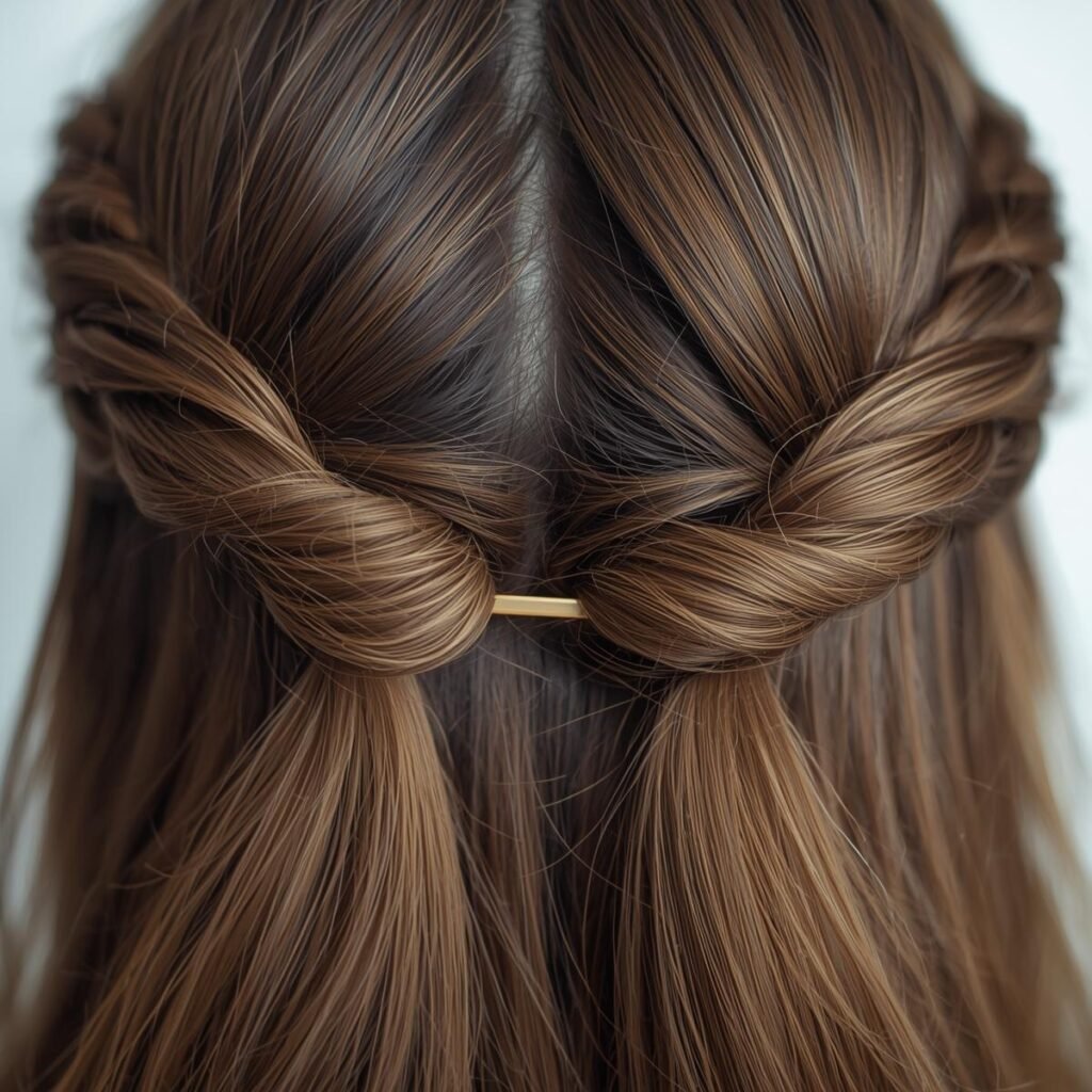 Twist two thick strands on each side and secure them in the middle with a thin hair tie for a simple, elegant finish.
